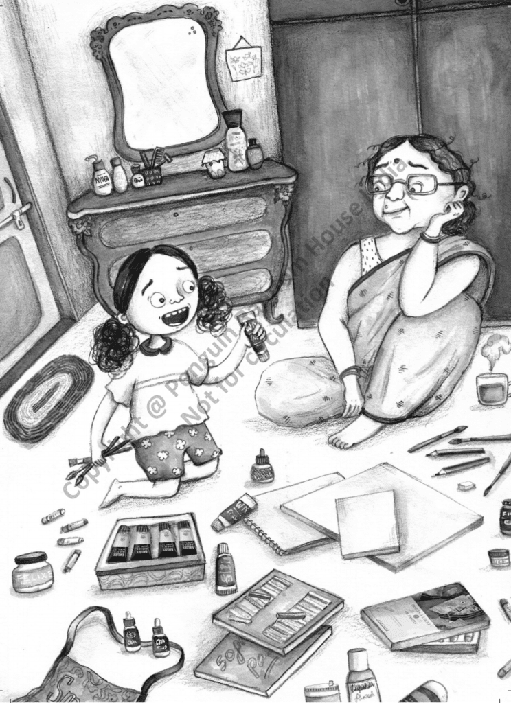 My Grandmother’s Masterpiece is a story from the point of view of the child, Nini. It portrays a Bengali household, where Nini lives with her working parents and her grandparents. While her mother is out to work, it is Nini’s minima who takes care of her and all her needs throughout the day. One day, Nini happens to discover that her grandmother used to be a great artist.
